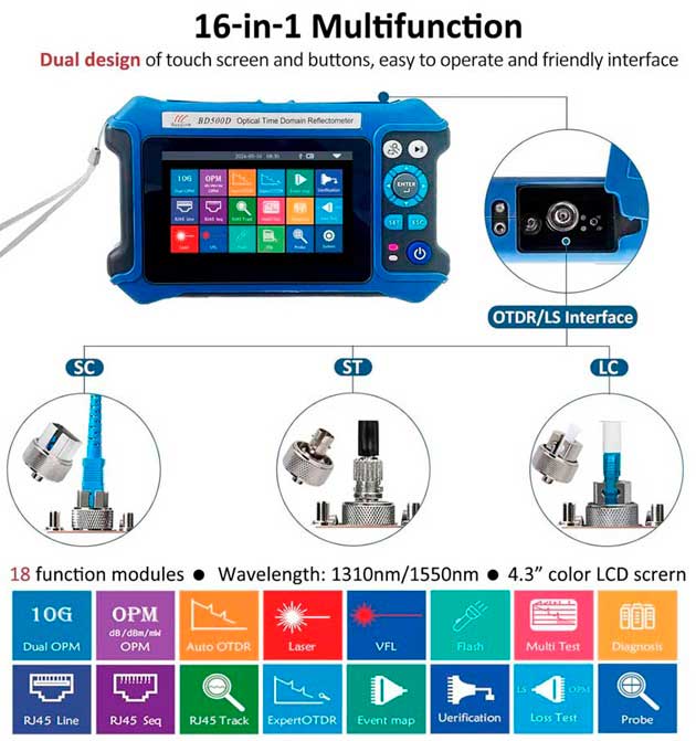 The BD500D OTDR machine is a compact, multi-function optical time domain reflectometer designed for professional fiber optic testing. It integrates OTDR, OPM, VFL, LS, optical loss test, and RJ45 cable measurement into one unit.