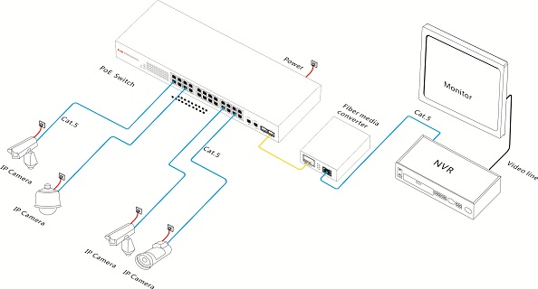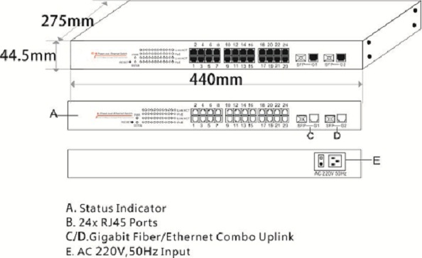 This BD-S31024FM switch provides a network point for data transmission. All the 24 Ethernet ports can be connected with 10/100Mps quickly, and the uplink port is 1.25Gbps fiber interface. The switch features simple and reliable design, automatic identification Ethernet requirements, duplex and high-speed.