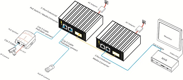 industrial PoE switch / media converter, with 2x 10/100M Ethernet PoE ports