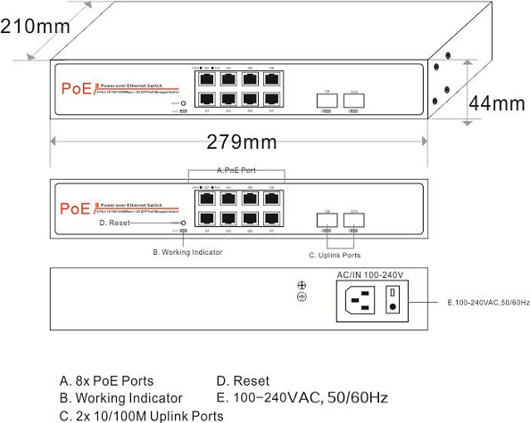 PoE Switch with 8x 10/100M Ports and 2x Gigabit Ports